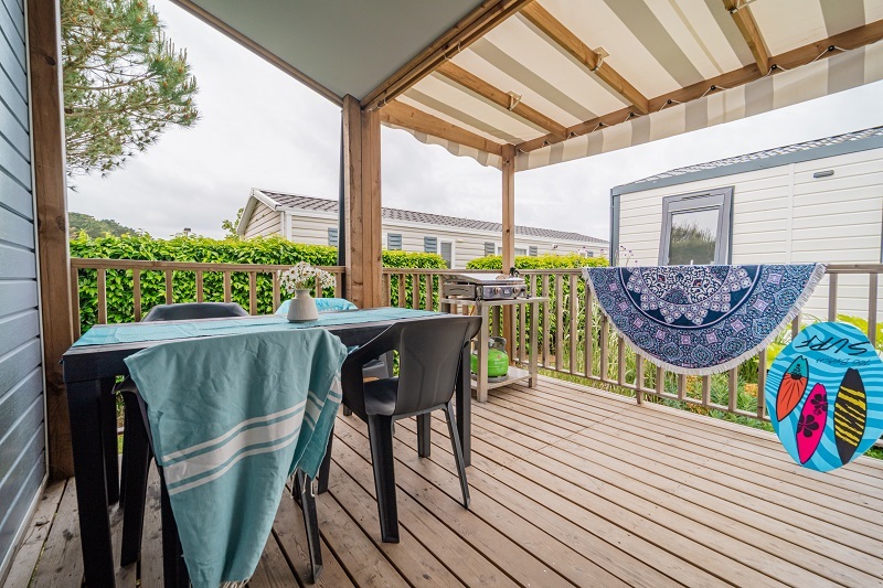 Terrasse bois semi-couverte, au sol ou intégrée avec salon de jardin.