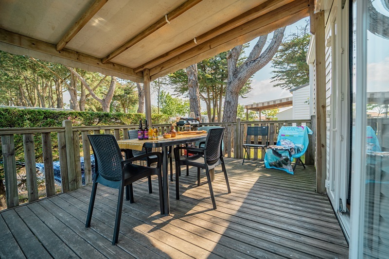 Terrasse bois semi-couverte, au sol ou intégrée avec salon de jardin.