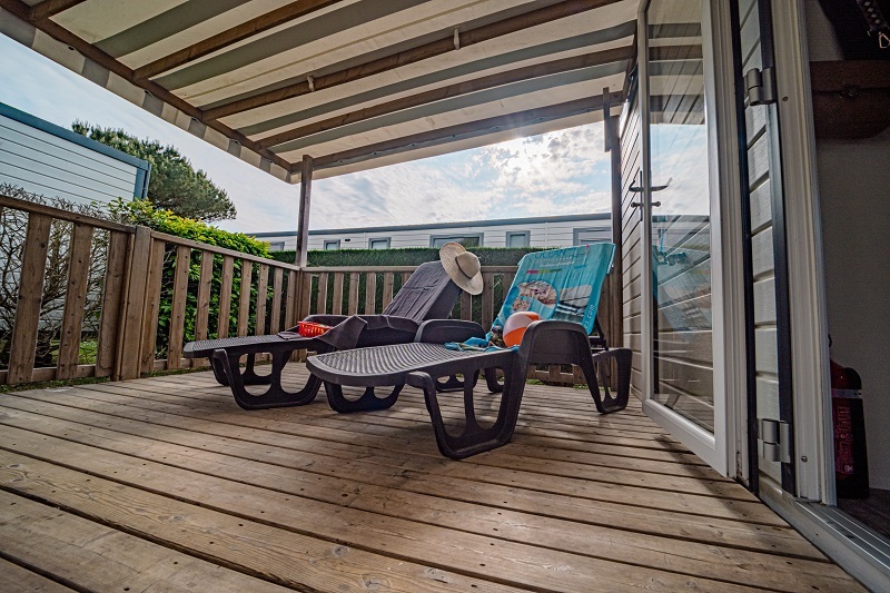 Terrasse bois semi-couverte ou intégrée avec salon de jardin et bains de soleil.